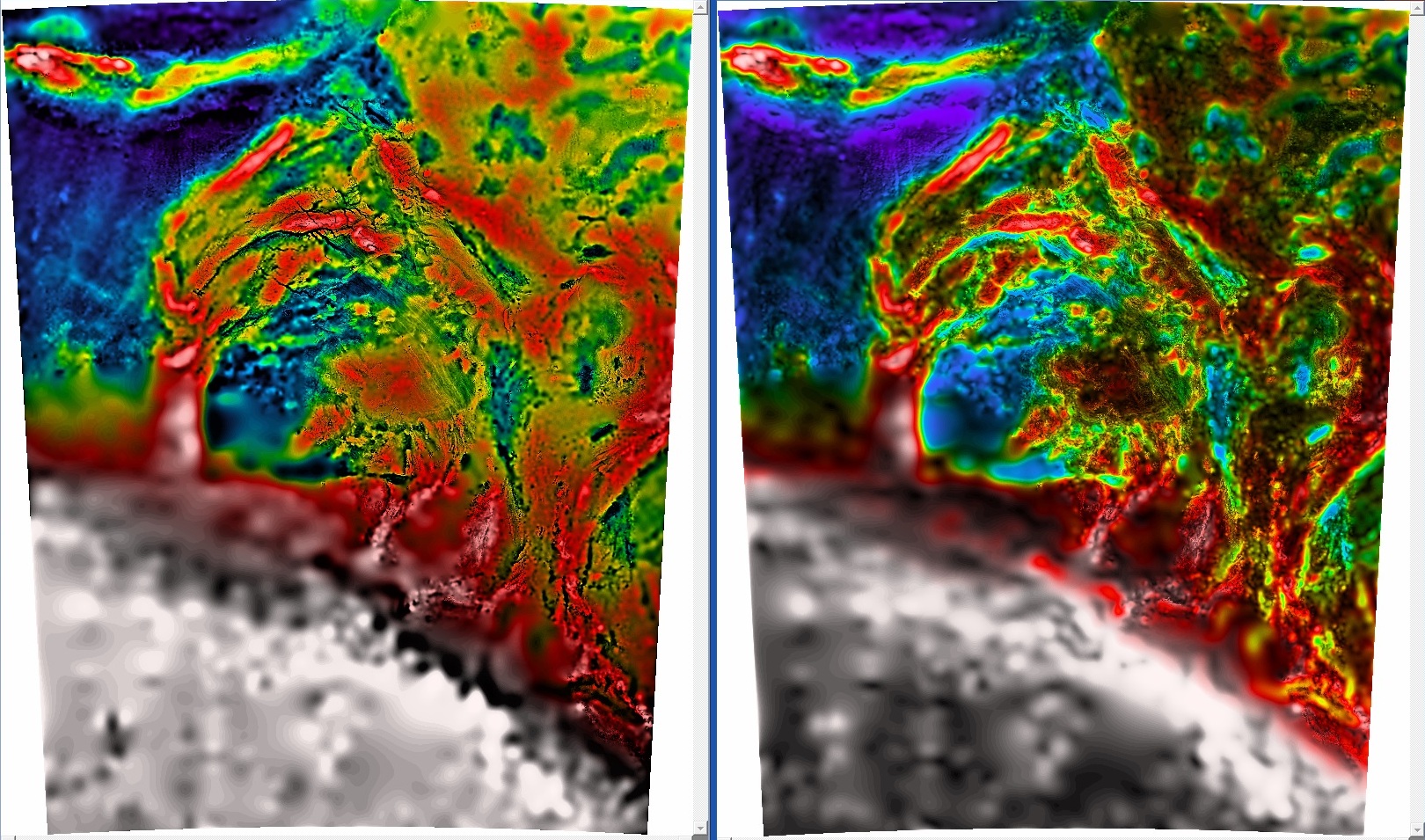 Compare the image on the left, which is our source dataset the Bouguer Gravity of South Australia. The pseudocolour is the BG, and the intensity is the 1VD of BG. No sunshade is required to perceive structural variation, the domaining is preserved, and the sources of anomalies are bright or weak according to their depth or density contrast and size. It almost looks a bit like we are beginning to "see through" the original image to get a new perspective on the geological variation in the Earth. Images that are created in this way, a single (or more) colour band plus a monotone intensity band, are called Drapes, or Colour Drapes. We are imagining that the Intensity image is like a surface, and we are painting the surface with a colour pattern that varies in a specific way in relation to the surface. This technique is used all the time in satellite imagery interpretation.