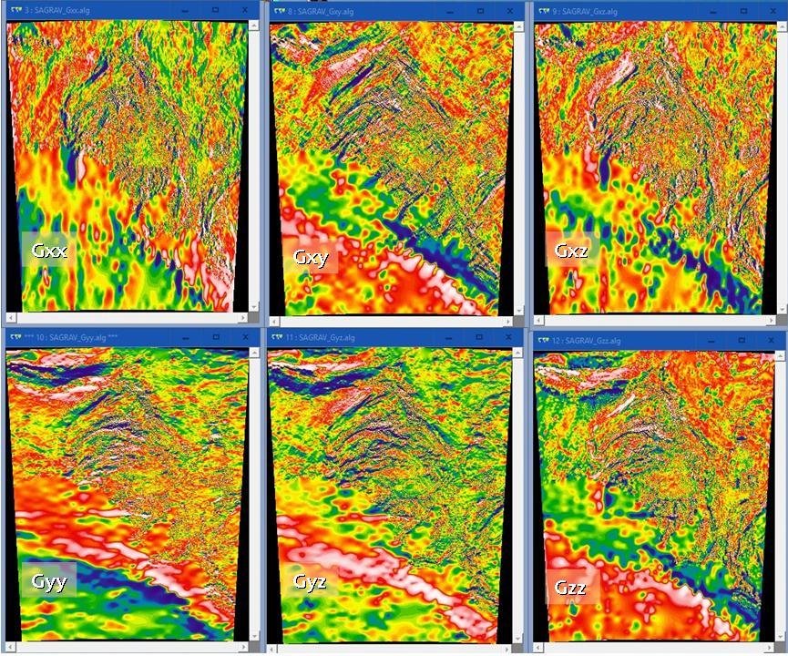 To examine what gravity gradient components of the tensor look like, observe the figure above where the vertical Bouguer Gravity for South Australia has been mathematically transformed into the principal tensor components. It is easy to see that, as expected, the Gzz is virtually equivalent to the 1VD of Bouguer Gravity and reflects vertical variations in the gravity gradient. Gxx and Gyy, being horizontal derivatives, show the geological trend variations in the North-South and East-West directions respectively. Gxz and Gyz represent the horizontal gradients with respect to the vertical and therefore tend to show where the Edges of anomalies are in the N-S/E-W directions, whilst Gxy shows the corners of anomalies.