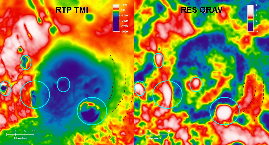 The gravity reveals better structural details than the magnetics. It can be seen, both from the residual Bouguer image and others, that the main anomaly is ringed by arcuate structures which have different relief to the central anomaly. The smaller dense magnetic anomalies occur mainly on the first ring (though in the centre too), and dykes radiate from the central anomaly. Two possiblities exist. The gravity low is due to a gigantic collapsed caldera or diatreme, or it is indeed an impact structure similar to Sudbury where magmatic intrusions occurred post-impact on the outer ring of the structure. In either scenario, examination of the greater area shows it to be highly prospective for polymetallic deposits and kimberlite exploration.